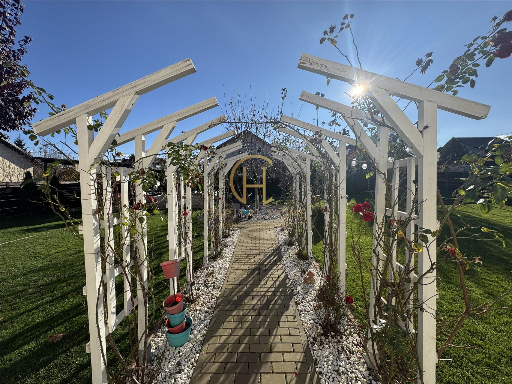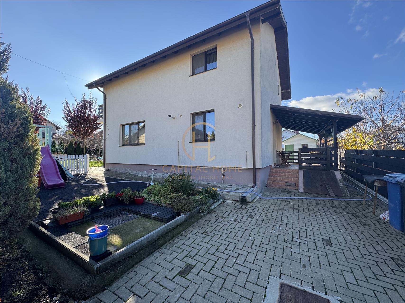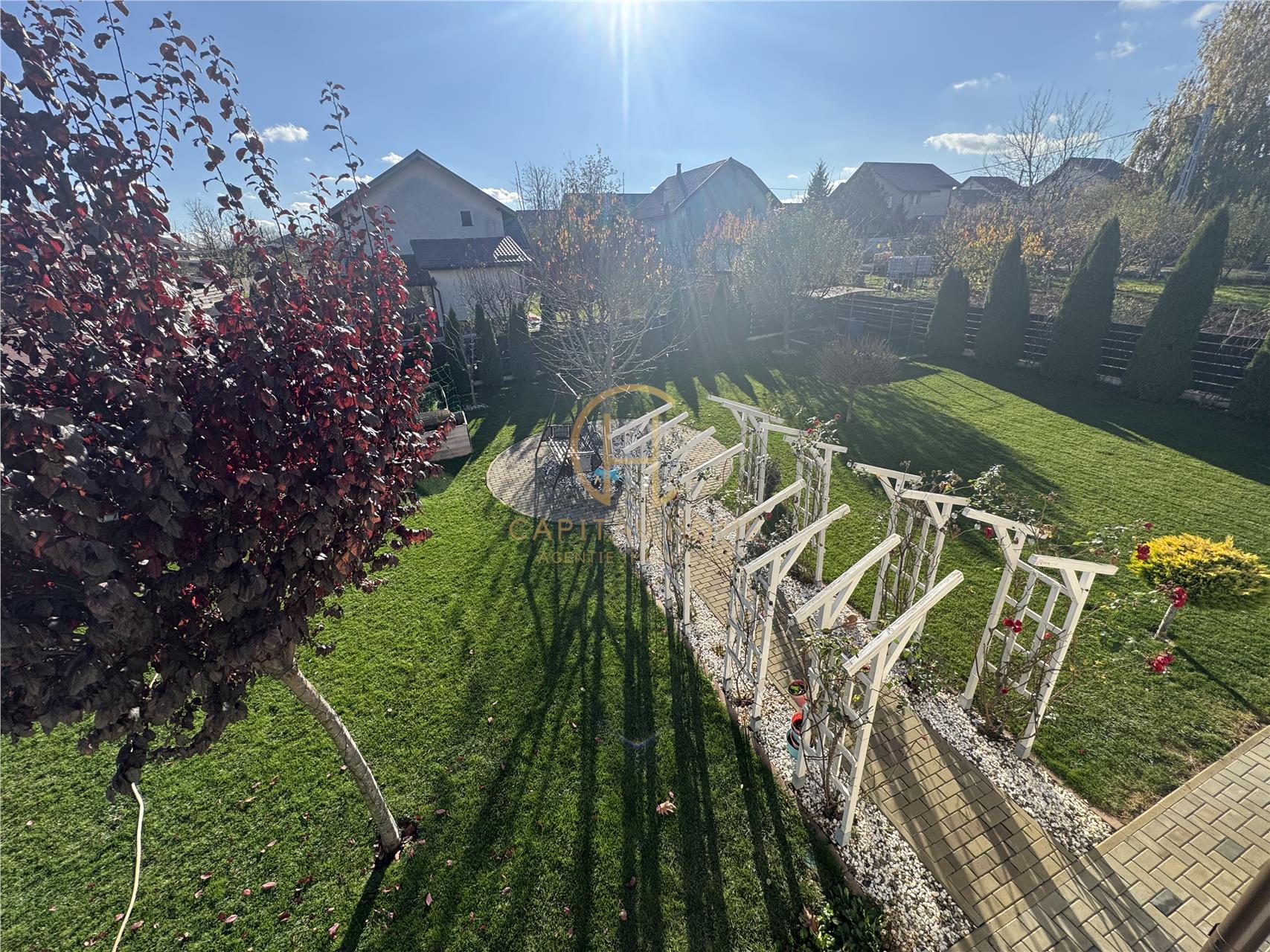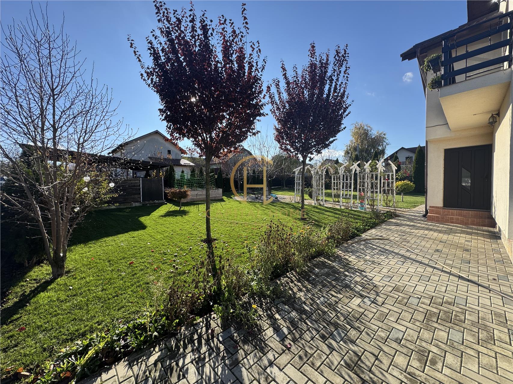 Curte amenajată cu gazon, pomi decorativi și loc de joacă pentru copii
